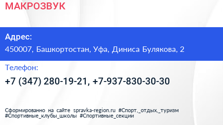 МАКРОЗВУК по адресу 450007, Башкортостан, Уфа, Диниса Булякова, 2 в дальнейшем Организация, размещена в следующих категориях: