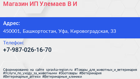 Магазин, ИП Улемаев В.И. по адресу 450001, Башкортостан, Уфа, Кировоградская, 33 в дальнейшем Организация, размещена в следующих категориях: