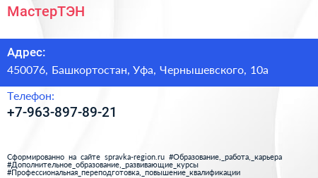 МастерТЭН по адресу 450076, Башкортостан, Уфа, Чернышевского, 10а в дальнейшем Организация, размещена в следующих категориях:
