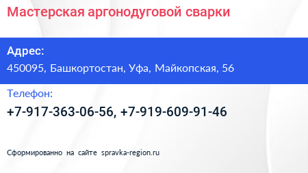 Мастерская аргонодуговой сварки по адресу 450095, Башкортостан, Уфа, Майкопская, 56 в дальнейшем Организация, размещена в следующих категориях: