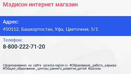 Мэдисон, интернет-магазин по адресу 450112, Башкортостан, Уфа, Цветочная, 5/1 в дальнейшем Организация, размещена в следующих категориях: