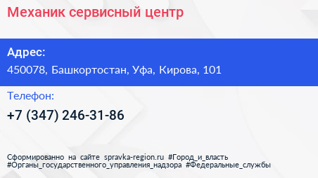 Механик, сервисный центр по адресу 450078, Башкортостан, Уфа, Кирова, 101 в дальнейшем Организация, размещена в следующих категориях: