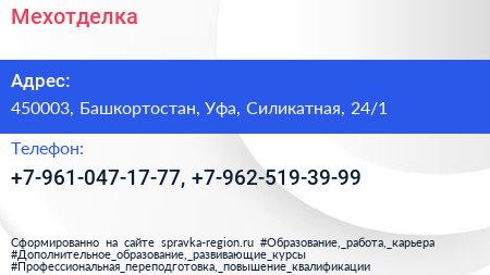 Мехотделка по адресу 450003, Башкортостан, Уфа, Силикатная, 24/1 в дальнейшем Организация, размещена в следующих категориях: