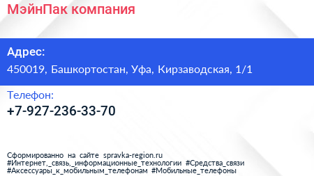 МэйнПак, компания по адресу 450019, Башкортостан, Уфа, Кирзаводская, 1/1 в дальнейшем Организация, размещена в следующих категориях: