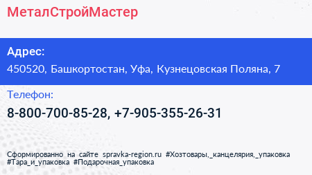 МеталСтройМастер по адресу 450520, Башкортостан, Уфа, Кузнецовская Поляна, 7 в дальнейшем Организация, размещена в следующих категориях: