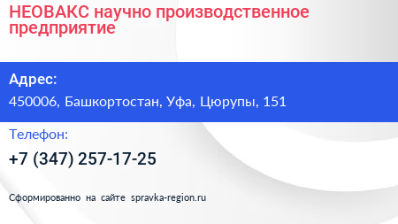 НЕОВАКС, научно-производственное предприятие по адресу 450006, Башкортостан, Уфа, Цюрупы, 151 в дальнейшем Организация, размещена в следующих категориях:
