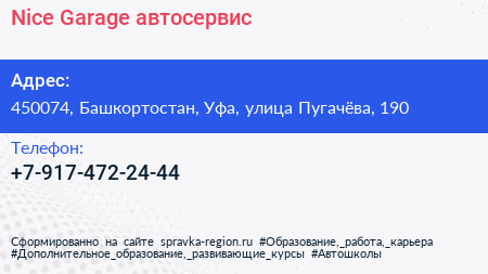 Nice Garage, автосервис по адресу 450074, Башкортостан, Уфа, улица Пугачёва, 190 в дальнейшем Организация, размещена в следующих категориях: