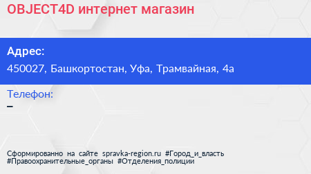 OBJECT4D, интернет-магазин по адресу 450027, Башкортостан, Уфа, Трамвайная, 4а в дальнейшем Организация, размещена в следующих категориях: