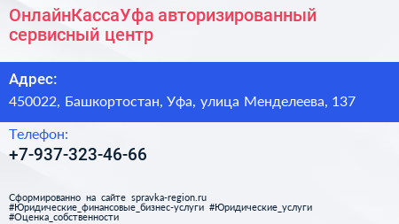 ОнлайнКассаУфа, авторизированный сервисный центр по адресу 450022, Башкортостан, Уфа, улица Менделеева, 137 в дальнейшем Организация, размещена в следующих категориях: