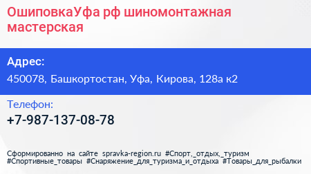ОшиповкаУфа.рф, шиномонтажная мастерская по адресу 450078, Башкортостан, Уфа, Кирова, 128а к2 в дальнейшем Организация, размещена в следующих категориях: