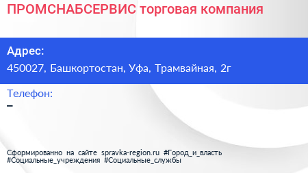 ПРОМСНАБСЕРВИС, торговая компания по адресу 450027, Башкортостан, Уфа, Трамвайная, 2г в дальнейшем Организация, размещена в следующих категориях: