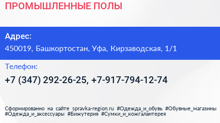 ПРОМЫШЛЕННЫЕ ПОЛЫ по адресу 450019, Башкортостан, Уфа, Кирзаводская, 1/1 в дальнейшем Организация, размещена в следующих категориях: