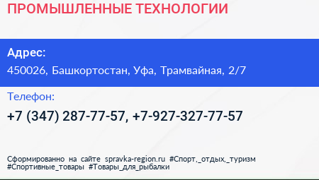 ПРОМЫШЛЕННЫЕ ТЕХНОЛОГИИ по адресу 450026, Башкортостан, Уфа, Трамвайная, 2/7 в дальнейшем Организация, размещена в следующих категориях: