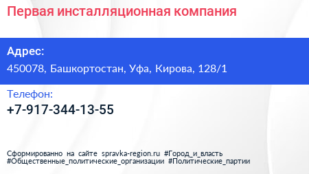 Первая инсталляционная компания по адресу 450078, Башкортостан, Уфа, Кирова, 128/1 в дальнейшем Организация, размещена в следующих категориях: