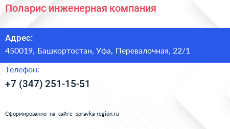 Поларис, инженерная компания по адресу 450019, Башкортостан, Уфа, Перевалочная, 22/1 в дальнейшем Организация, размещена в следующих категориях: