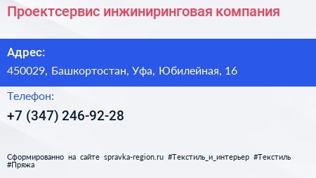 Проектсервис, инжиниринговая компания по адресу 450029, Башкортостан, Уфа, Юбилейная, 16 в дальнейшем Организация, размещена в следующих категориях: