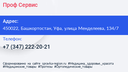 Проф-Сервис по адресу 450022, Башкортостан, Уфа, улица Менделеева, 134/7 в дальнейшем Организация, размещена в следующих категориях: