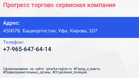 Прогресс, торгово-сервисная компания по адресу 450078, Башкортостан, Уфа, Кирова, 107 в дальнейшем Организация, размещена в следующих категориях: