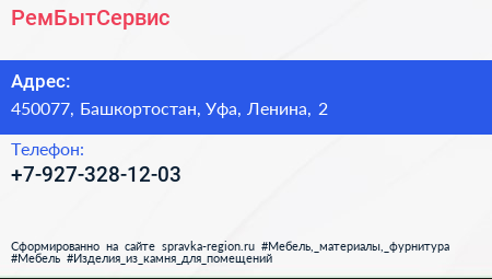 РемБытСервис по адресу 450077, Башкортостан, Уфа, Ленина, 2 в дальнейшем Организация, размещена в следующих категориях: