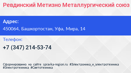 Ревдинский Метизно-Металлургический союз по адресу 450064, Башкортостан, Уфа, Мира, 14 в дальнейшем Организация, размещена в следующих категориях: