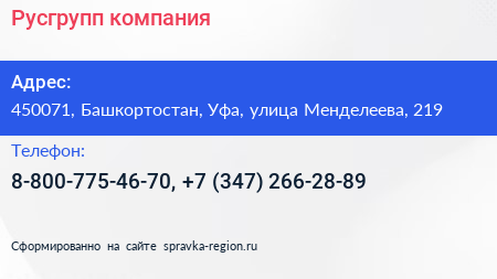 Русгрупп, компания по адресу 450071, Башкортостан, Уфа, улица Менделеева, 219 в дальнейшем Организация, размещена в следующих категориях: