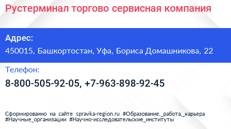 Рустерминал, торгово-сервисная компания по адресу 450015, Башкортостан, Уфа, Бориса Домашникова, 22 в дальнейшем Организация, размещена в следующих категориях: