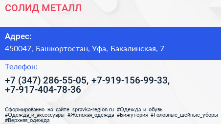 СОЛИД-МЕТАЛЛ по адресу 450047, Башкортостан, Уфа, Бакалинская, 7 в дальнейшем Организация, размещена в следующих категориях: