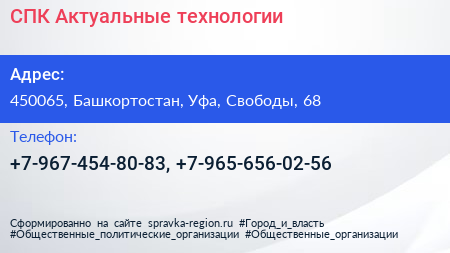 СПК Актуальные технологии по адресу 450065, Башкортостан, Уфа, Свободы, 68 в дальнейшем Организация, размещена в следующих категориях: