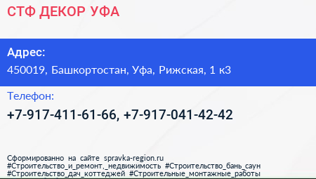 СТФ ДЕКОР-УФА по адресу 450019, Башкортостан, Уфа, Рижская, 1 к3 в дальнейшем Организация, размещена в следующих категориях: