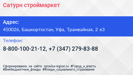 Сатурн, строймаркет по адресу 450026, Башкортостан, Уфа, Трамвайная, 2 к3 в дальнейшем Организация, размещена в следующих категориях: