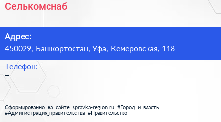 Селькомснаб по адресу 450029, Башкортостан, Уфа, Кемеровская, 118 в дальнейшем Организация, размещена в следующих категориях: