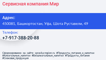 Сервисная компания Мир по адресу 450081, Башкортостан, Уфа, Шота Руставели, 49 в дальнейшем Организация, размещена в следующих категориях: