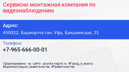Сервисно-монтажная компания по видеонаблюдению по адресу 450022, Башкортостан, Уфа, Бакалинская, 31 в дальнейшем Организация, размещена в следующих категориях: