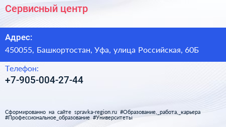 Сервисный центр по адресу 450055, Башкортостан, Уфа, улица Российская, 60Б в дальнейшем Организация, размещена в следующих категориях: