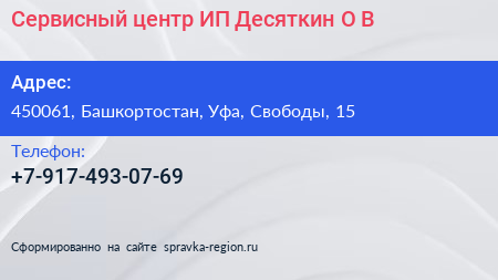 Сервисный центр, ИП Десяткин О.В. по адресу 450061, Башкортостан, Уфа, Свободы, 15 в дальнейшем Организация, размещена в следующих категориях: