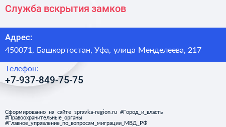Служба вскрытия замков по адресу 450071, Башкортостан, Уфа, улица Менделеева, 217 в дальнейшем Организация, размещена в следующих категориях: