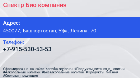 Спектр-Био, компания по адресу 450077, Башкортостан, Уфа, Ленина, 70 в дальнейшем Организация, размещена в следующих категориях: