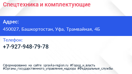 Спецтехника и комплектующие по адресу 450027, Башкортостан, Уфа, Трамвайная, 4Б в дальнейшем Организация, размещена в следующих категориях:
