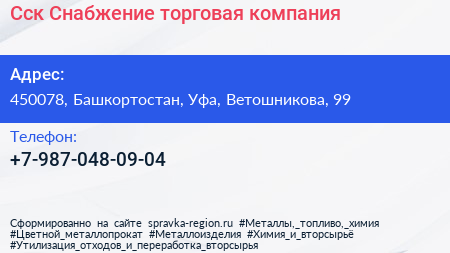 Сск Снабжение, торговая компания по адресу 450078, Башкортостан, Уфа, Ветошникова, 99 в дальнейшем Организация, размещена в следующих категориях: