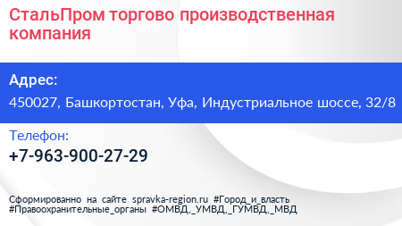 СтальПром, торгово-производственная компания по адресу 450027, Башкортостан, Уфа, Индустриальное шоссе, 32/8 в дальнейшем Организация, размещена в следующих категориях: