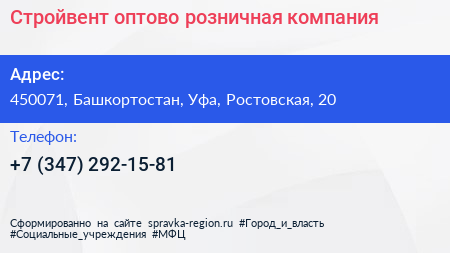 Стройвент, оптово-розничная компания по адресу 450071, Башкортостан, Уфа, Ростовская, 20 в дальнейшем Организация, размещена в следующих категориях: