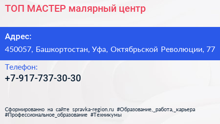 ТОП МАСТЕР, малярный центр по адресу 450057, Башкортостан, Уфа, Октябрьской Революции, 77 в дальнейшем Организация, размещена в следующих категориях: