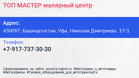 ТОП МАСТЕР, малярный центр по адресу 450097, Башкортостан, Уфа, Николая Дмитриева, 17/1 в дальнейшем Организация, размещена в следующих категориях:
