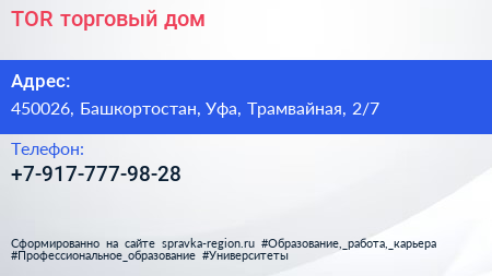 TOR, торговый дом по адресу 450026, Башкортостан, Уфа, Трамвайная, 2/7 в дальнейшем Организация, размещена в следующих категориях: