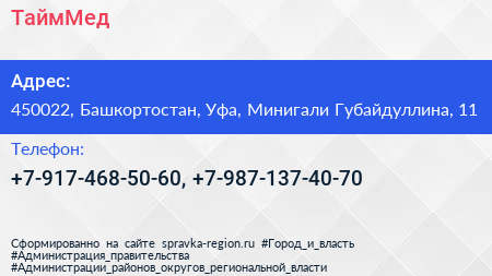 ТаймМед по адресу 450022, Башкортостан, Уфа, Минигали Губайдуллина, 11 в дальнейшем Организация, размещена в следующих категориях: