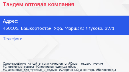 Тандем, оптовая компания по адресу 450105, Башкортостан, Уфа, Маршала Жукова, 39/1 в дальнейшем Организация, размещена в следующих категориях: