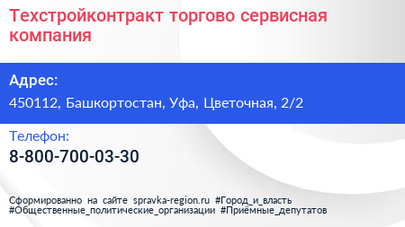Техстройконтракт, торгово-сервисная компания по адресу 450112, Башкортостан, Уфа, Цветочная, 2/2 в дальнейшем Организация, размещена в следующих категориях: