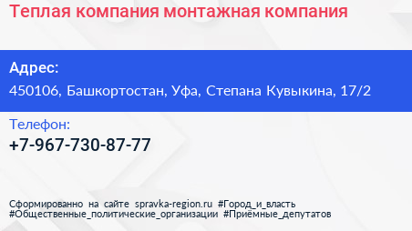 Теплая компания, монтажная компания по адресу 450106, Башкортостан, Уфа, Степана Кувыкина, 17/2 в дальнейшем Организация, размещена в следующих категориях: