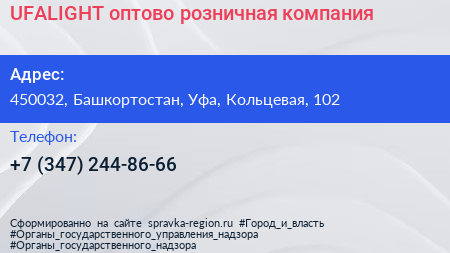 UFALIGHT, оптово-розничная компания по адресу 450032, Башкортостан, Уфа, Кольцевая, 102 в дальнейшем Организация, размещена в следующих категориях: