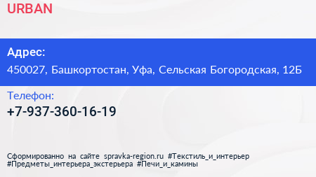 URBAN по адресу 450027, Башкортостан, Уфа, Сельская Богородская, 12Б в дальнейшем Организация, размещена в следующих категориях: